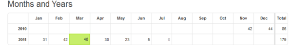 As you can see from the following table, I had about 40 hits for November, December, January, February, and March…and then things really tumbled…until I got to, well…FIVE! in June 2011. Six months and my blog is virtually dead!